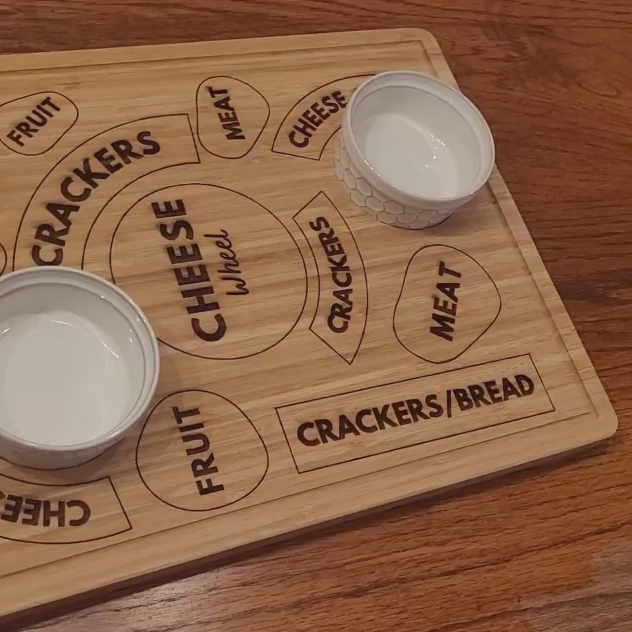 This Custom Charcuterie Board is a unique and timeless Gift. Permanently Engraved onto Premium wood, this Charcuterie Board show the layout of the snacks is the perfect Gift.