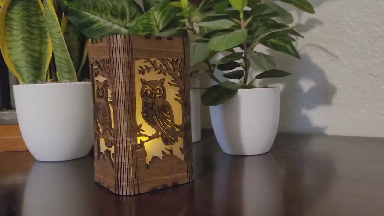These lanterns are laser cut from 3mm Basswood stained with English Chestnut for a deep rich finish. The designs cast a warm glow. The Owl in a tree offers a serene nature scene with a lot of attention given to details of the cutout.